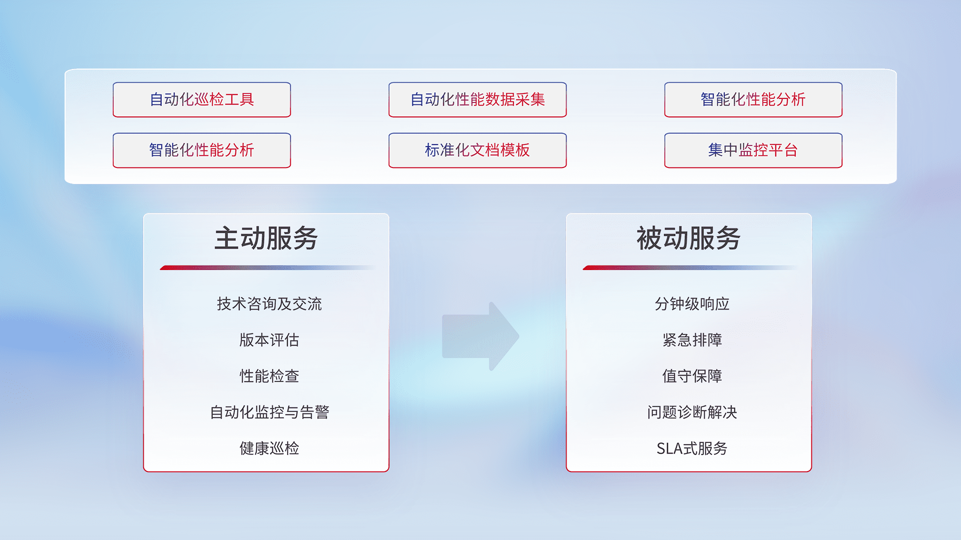 智能化工具和标准化文档,,保障服务质量,,,提供主动服务(包含技术咨询、、版本评估、、、性能检查、、、自动化监控与告警、、、健康巡检)和被动服务包含(分钟级响应、、紧急排障、、、、值守保障、、、、问题诊断解决、、SLA服务)。。。